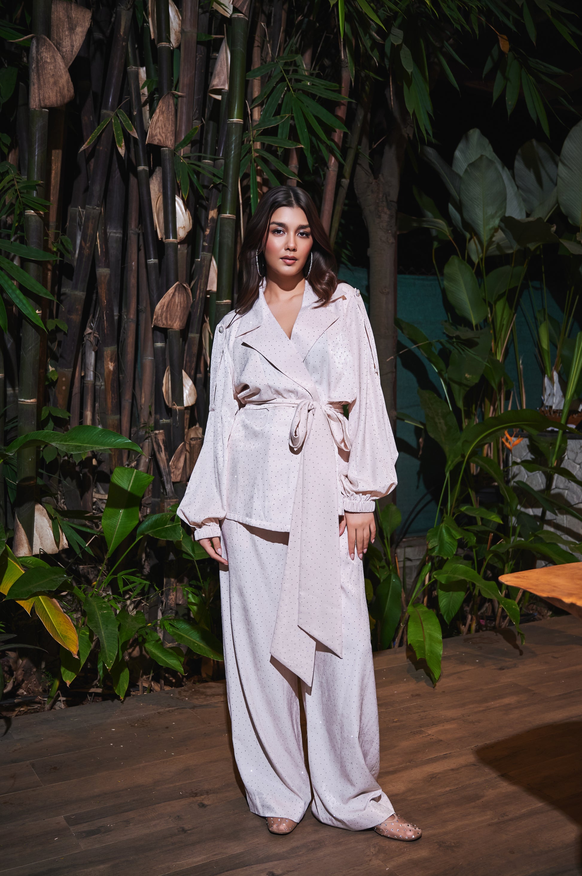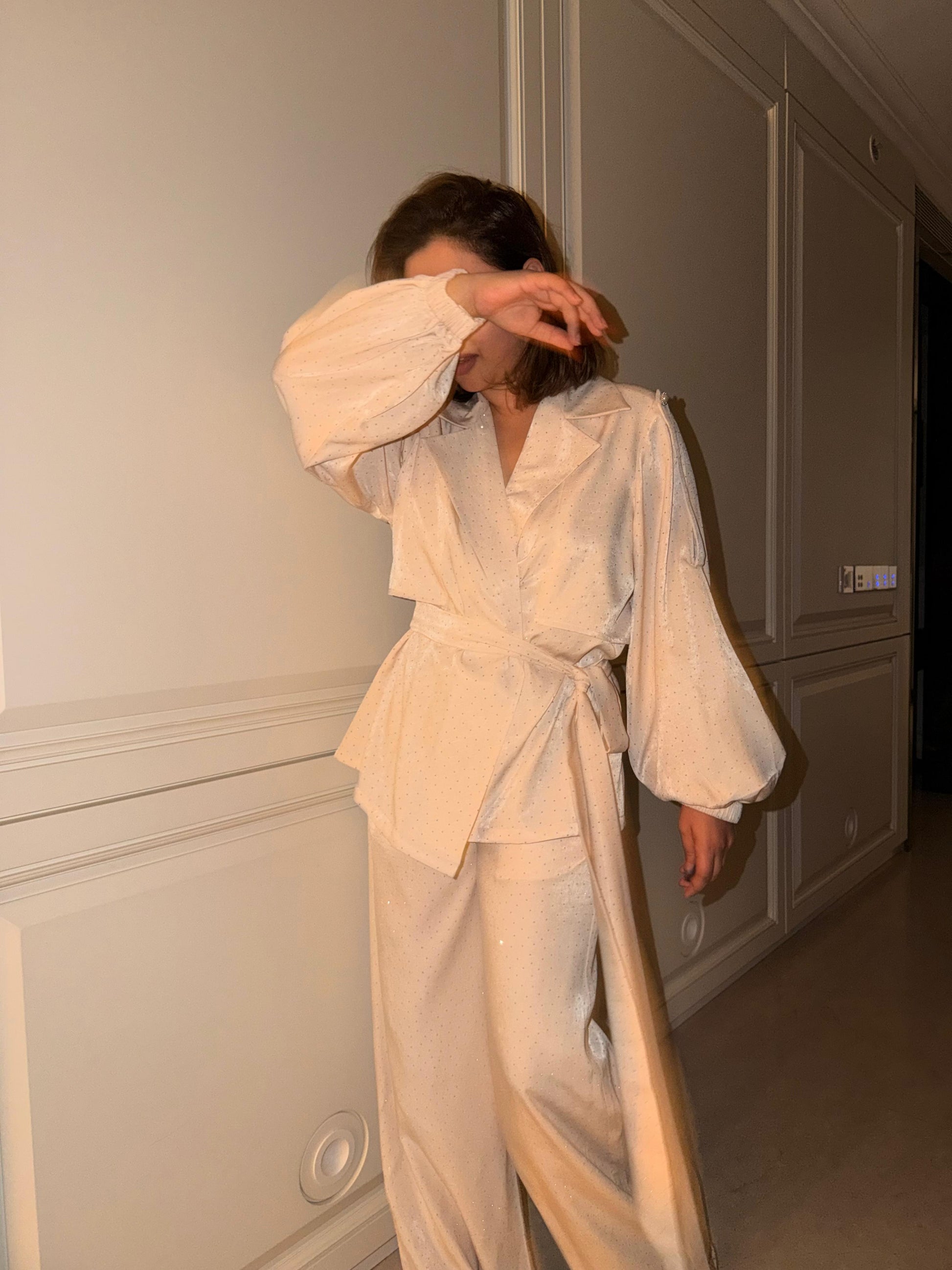 - Off white jacket and pants coord set with belt